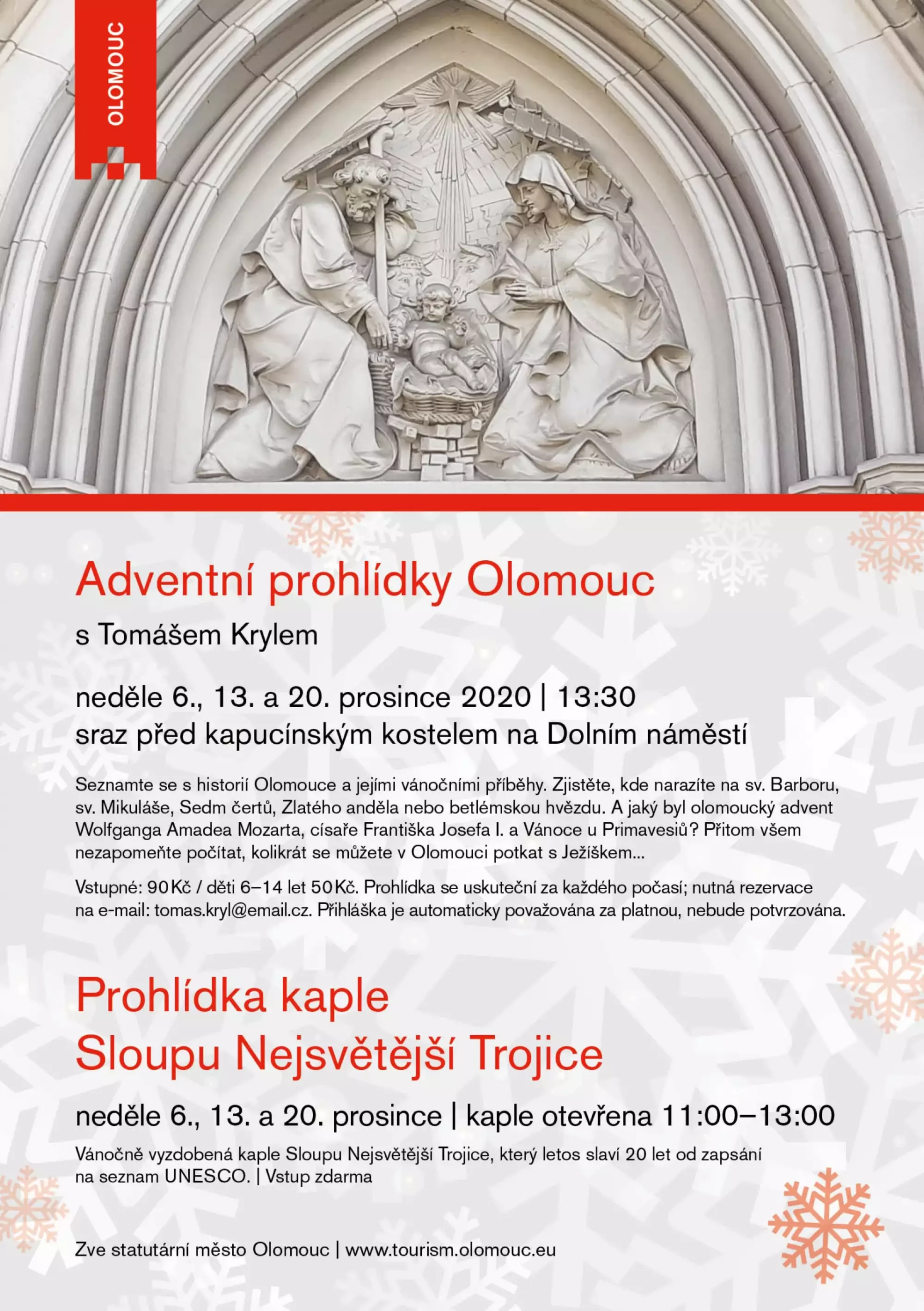 Informační centrum Olomouc připravilo Adventní prohlídky města. Průvodcem bude Tomáš Kryl. „Prohlídky se uskuteční za každého počasí a je na ně nutná předchozí rezervace. Vstupné je 90 korun, pro děti 6–14 let 50 korun,“ uvádí vedoucí IC Olomouc Jitka Lučanová.
